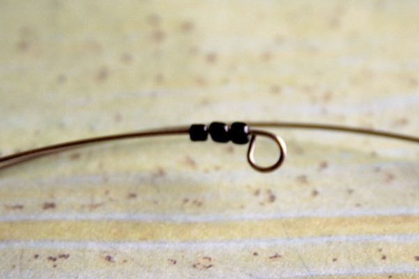 4. Продеваем так, чтобы с одно стороны остался «хвост» не более 2-3 см. На этот «хвост» надеваем три бисеринки, 1 зажимная бусинка, 1 бисеринка.