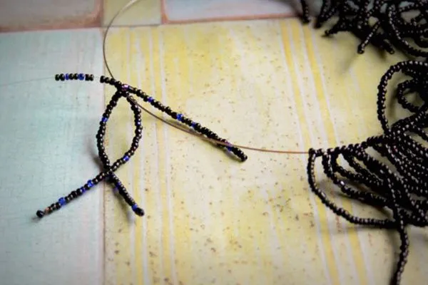 6. Доходим до мемори-проволоки и надеваем ещё одну бисеринку, в неё продеваем длинный хвост лески и снова набираем бисер, нужно вам количество, далее снова отправляем леску в обратном направлении.