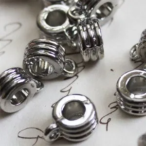 4. Звено с каплей присоединяем к бейлу, зажимаем до конца петлю. Далее нужно нанизать на пин с кольцом бейл, по бокам которого находятся рондели, плоские металлические, а затем круглые металлические бусины.