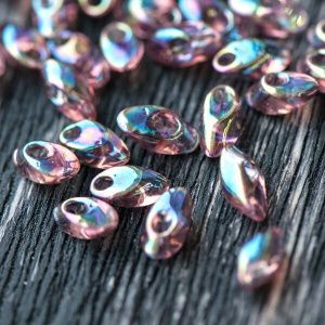 5. Для второго и следующих рядов мы берем мелкий бисер. Нанизываем 1 бисеринку и продеваем леску сразу в 2 бисеринки первого ряда, методом обратный стежок.