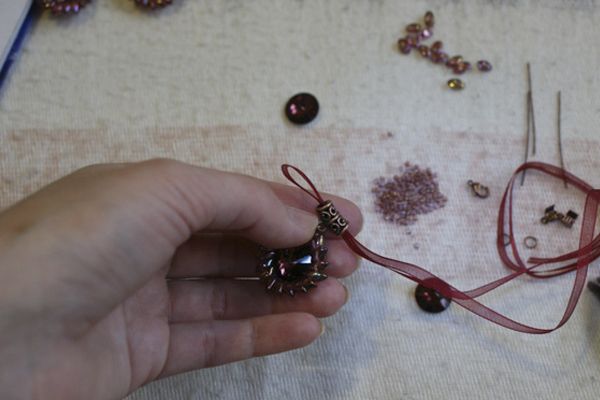 23. Соединим петельку на нашем кабошоне и бейл кольцом. Продеваем через бейл ленту. Крепим зажимы на краях ленты. Присоединяем замочек.