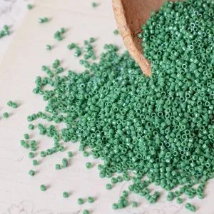 • 1. Приступим к заготовкам листочков. Листочки плетем в технике мозаичного плетения из светло-зеленого бисера.