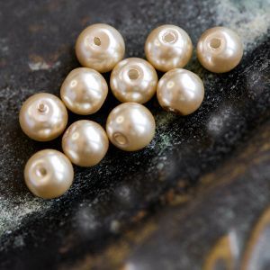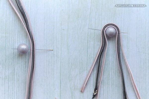 3. Нанизывайте на нее жемчужину 6мм. Следом нанизывайте 3 сутажных слоя, так, чтобы они плотно облегали жемчужину.