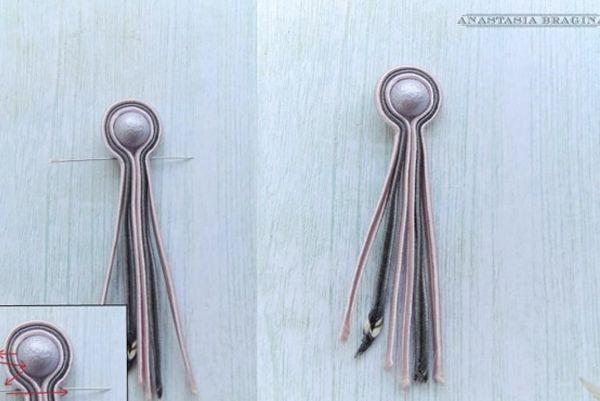 1. Заготовьте 4 розовых и 2 серых сутажных отрезка длиной по 15 см. Кончики отрезков обработайте клеем, чтобы не пушились.