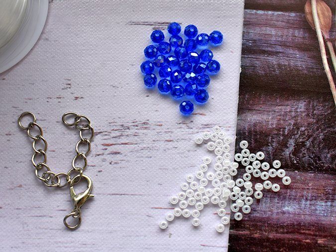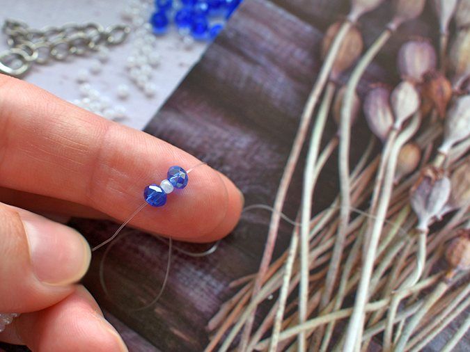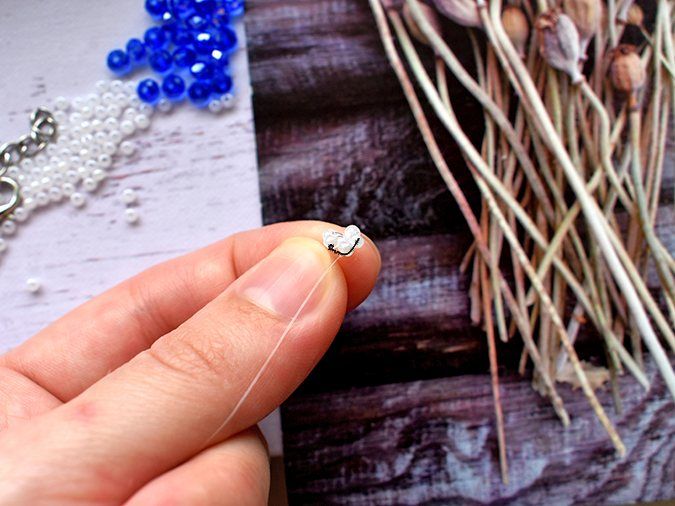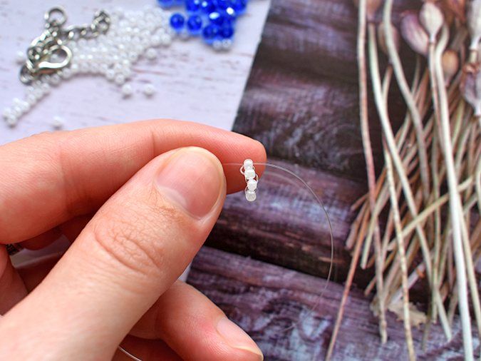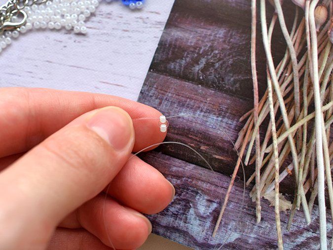 • 1. На леску нанизываем 2 бисерины, вторую бисерину проходим другим концом лески параллельно