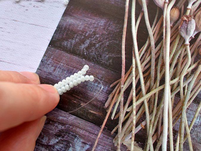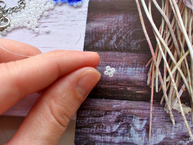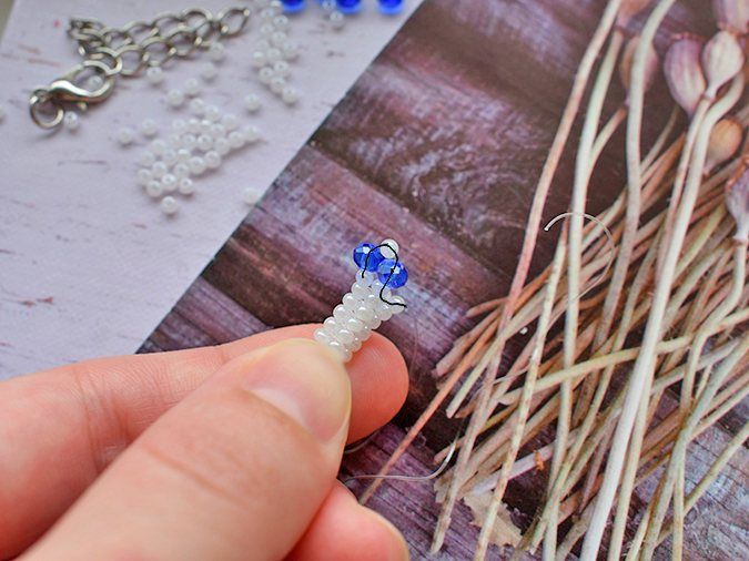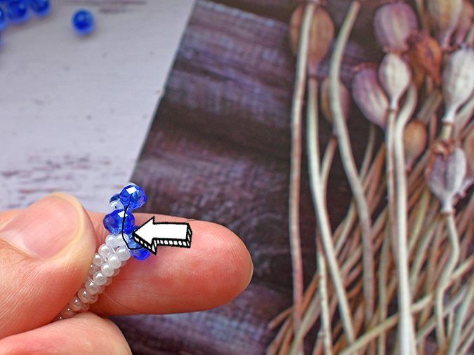 • 7. Включаем в работу бусины. На рабочую леску набираем бусину, бисеринку и еще бусину, выводим через вторую бисерину нижнего ряда