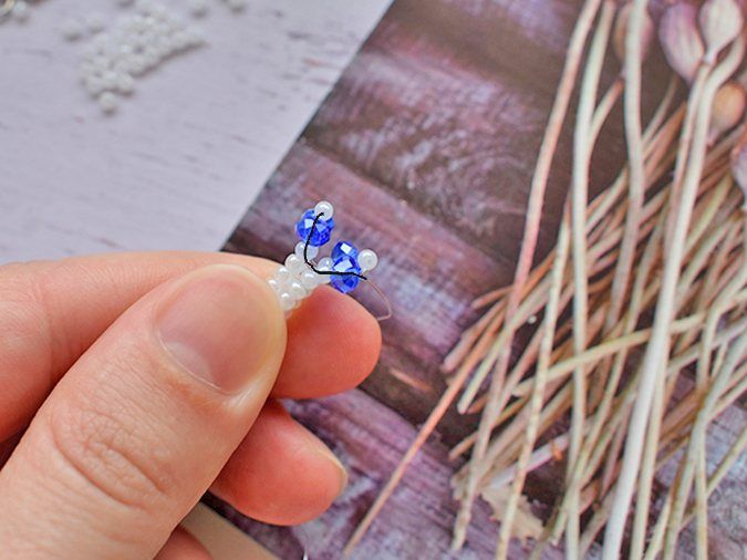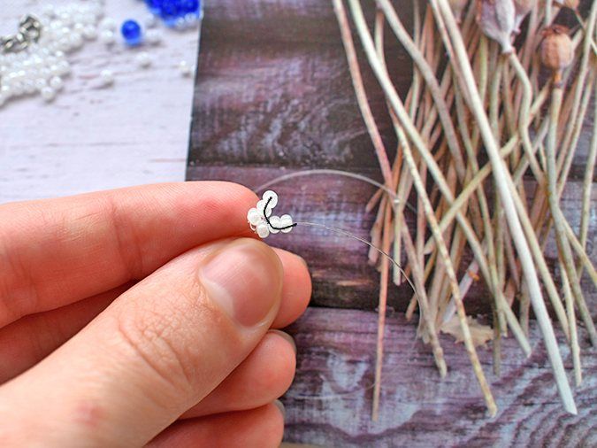 • 4. На рабочий конец лески нанизываем 2 бисерины, проводим ее во 2 бисеринку первого ряда сверху вниз