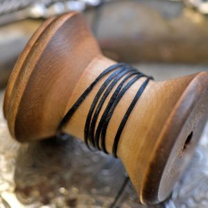 3. Берем основу браслета – нить 40 см, надеваем на нее 3 бусины из агата по центру и 2 металлические бусины с орнаментом по бокам. Помещаем все бусины на середину нити.