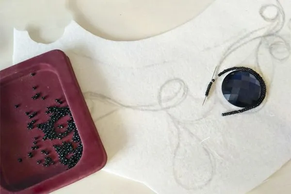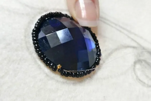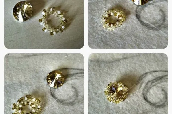 • 6. Теперь следует оплести риволи бисером, чтобы пришить их к фетру. аберите четное количество бисерин по размеру риволи и скрепите в кружочек.
