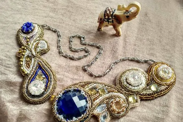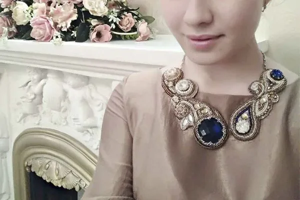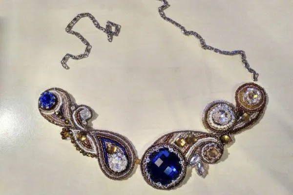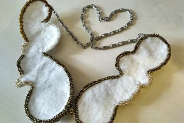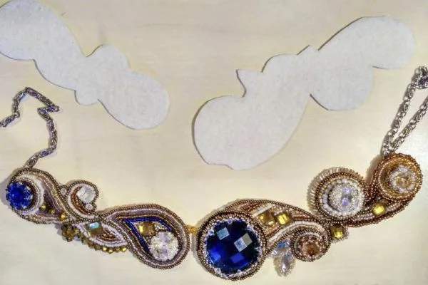 • 14. После того как были соединены два части изделия, лучше его примерить: приложить на платье или на шею, чтобы понять где лучше расположить цепочку.