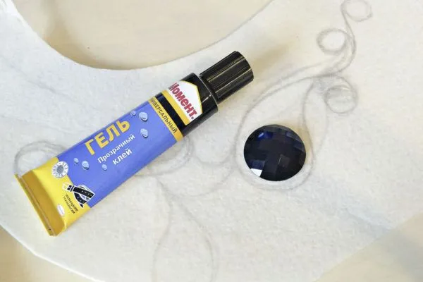 • 7. Готовую, обшитую риволи пришиваем к фетру в заранее отмеченное карандашом место. Обшиваем новый элемент по кругу, чтобы сделать более плавный переход от фетра к риволи.