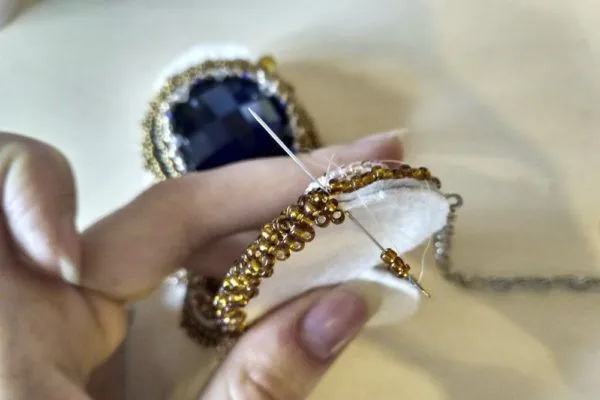• 17. Для обшивки берем тот же бисер каким вышит крайний ряд украшения.