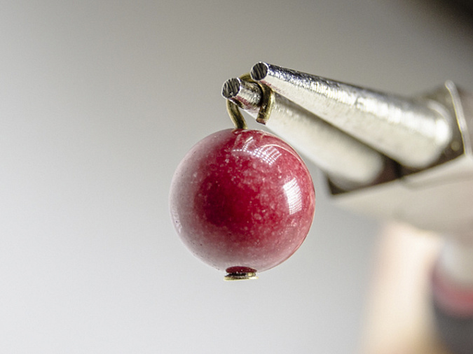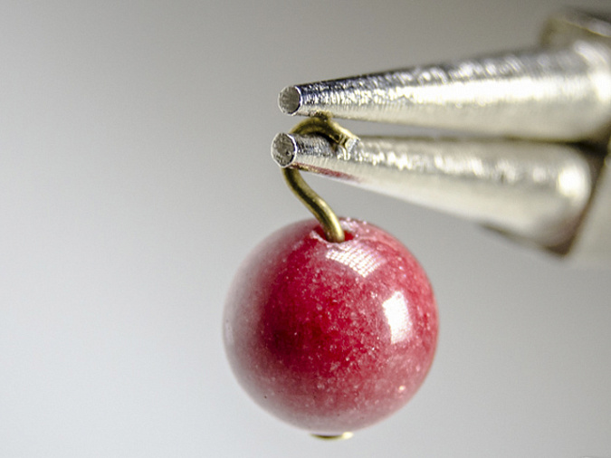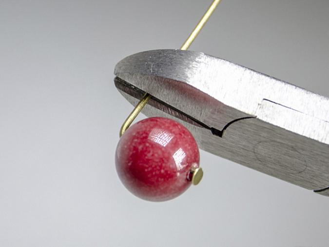• 1. Нанизываем бусину на пин-гвоздик. Тонкогубцами захватываем пин плотно у бусины и делаем легкий изгиб как можно ближе к бусине. Сгибаем пин пальцами под 90 градусов к бусине.