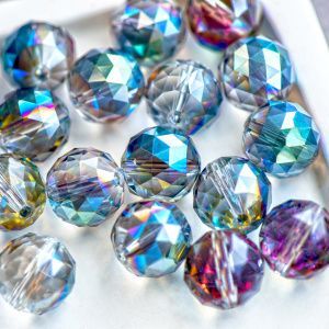 бусина, стекло 14, граненая, цвет прозрачный бензиновый, 14 мм